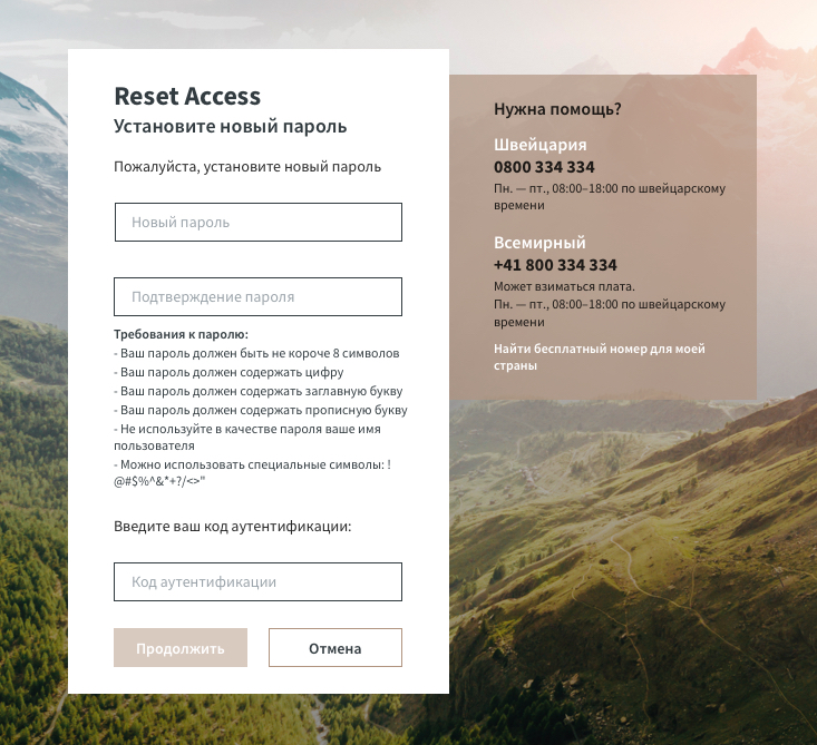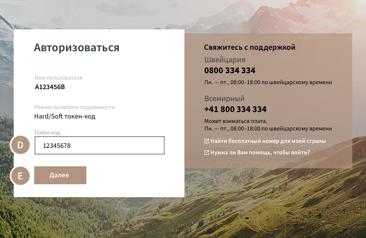 Чтобы получить доступ к eBanking, необходимо отправить комбинацию имени пользователя, пароля и кода, созданного токеном (программным или аппаратным).