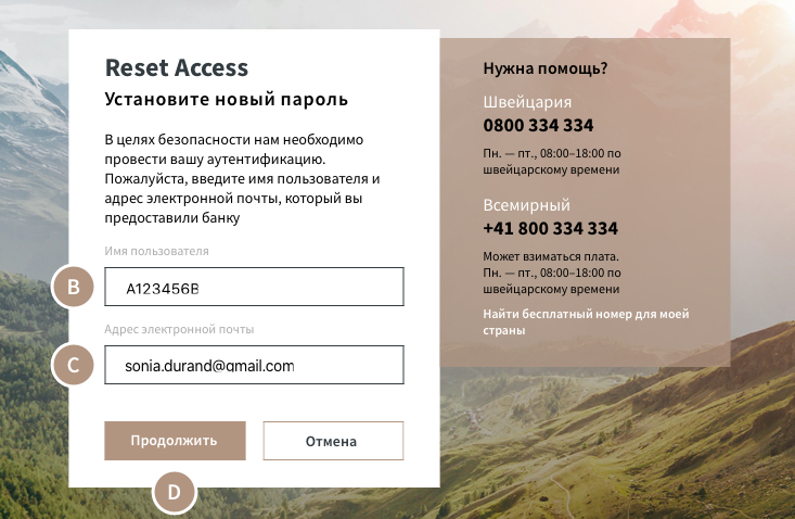 При нажатии на «Продолжить» (D) будет создано электронное письмо для сброса пароля.